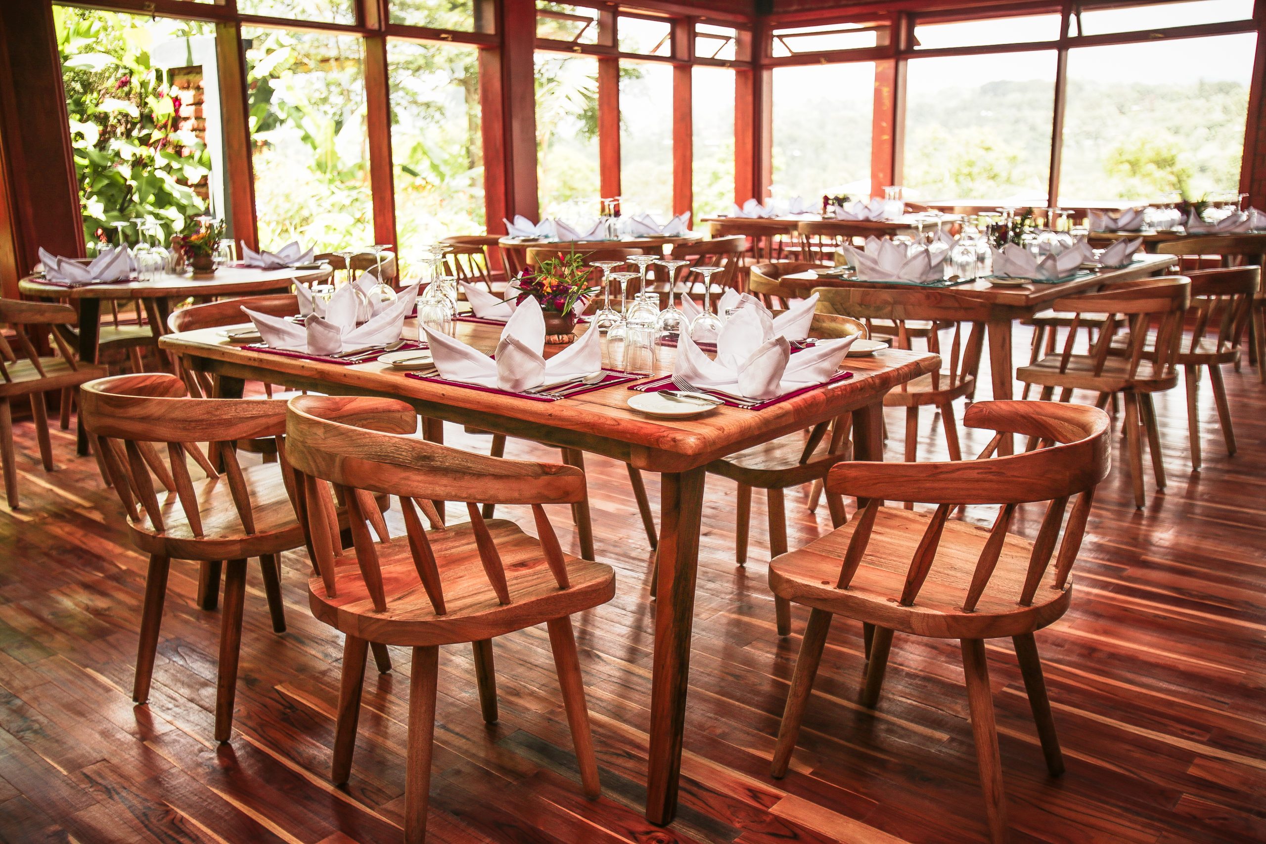 Our dining area was designed to bring the outdoor gardens inside for your dining enjoyment. Floor to ceiling windows offer views to the flower garden and over the pool to the hills beyond. There is a limited outdoor area for those who enjoy alfresco dining and also a nice bar table on the verandah near the gift shop for morning coffee or sundowners overlooking the pool and coffee gardens.